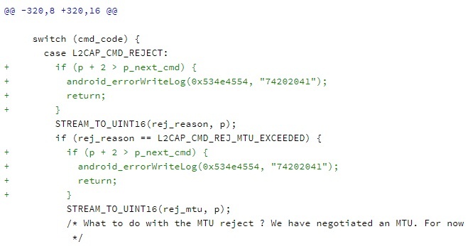 CVE-2018-9359漏洞位于L2CAP协议模块,漏洞类型是越界读。可以通过谷歌官方公告看到漏洞补丁。漏洞补丁代码位于/stack/l2cap/l2c_main.cc文件中的process_l2cap_cmd函数中,该函数主要功能是处理接收的L2CAP协议的信令包。