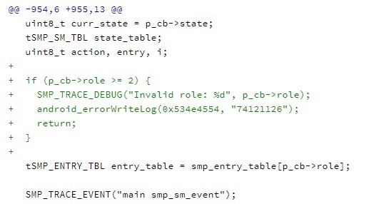 CVE-2018-9365是SMP(security manager protocol)协议中一个数组越界漏洞。该漏洞出现在smp_sm_event函数中,代码路径为:\smp\smp_main.cc。谷歌官方补丁代码如下。