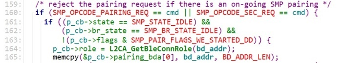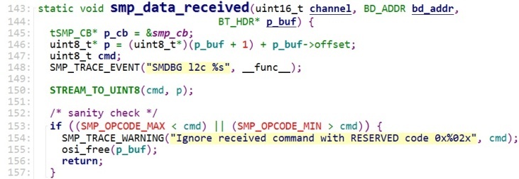 可以看到,smp_entry_table数组中只有两项,一个是针对主设备,一个是针对从设备。当有数据包通过L2CAP在SMP信道中接收到时,会调用smp_data_received函数进行处理。Smp_data_received函数代码如下。