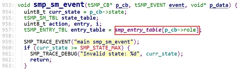 调用smp_sm_event函数,补丁前的代码在957行由于没有判断p_cb->role的大小,导致数组越界访问。