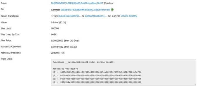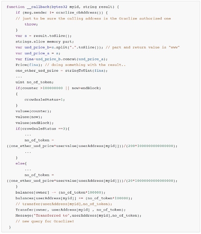 SIGMA合约使用了Oraclize服务查询汇率。该合约的__callback回调函数如下: