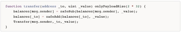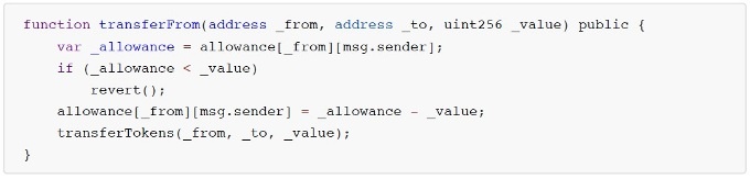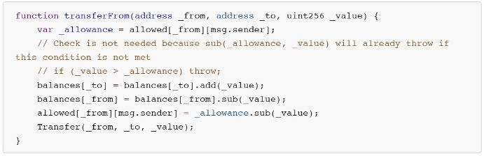• B账户调用transferFrom,从A账户转1单位代币到智能合约;transferFrom调用sell函数时触发整数溢出,即0-1=2^255。B账户在余额为0的情况下获得了最大额度的token。