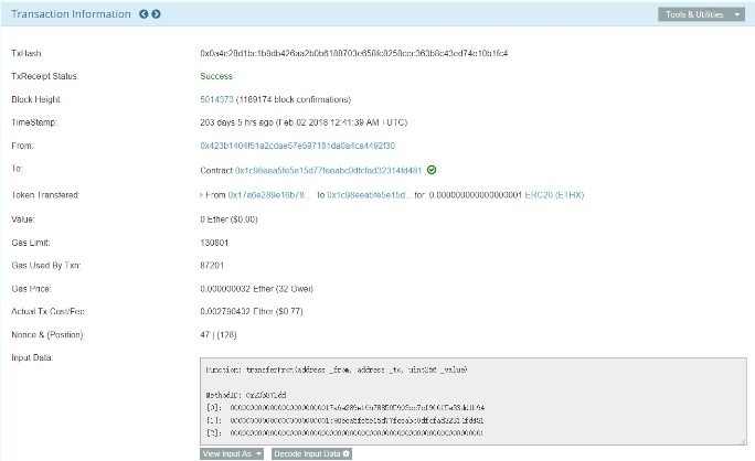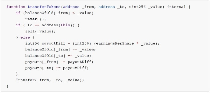 ETHX是一个典型的庞氏代币合约。该合约可以看成虚拟币交易所,但只有ETH和ETHX (ERC20 token)交易对,每次交易,都有5%的token分配给整个平台的已有的token持有者,因此token持有者在持币期间,将会直接赚取新购买者和旧抛售者的手续费。从ETHX合约代码可以看出,该合约对transferFrom函数进行了扩展,transferFrom函数首先进行allowance限额判定,然后调用了自定义的transferTokens函数来完成转账。