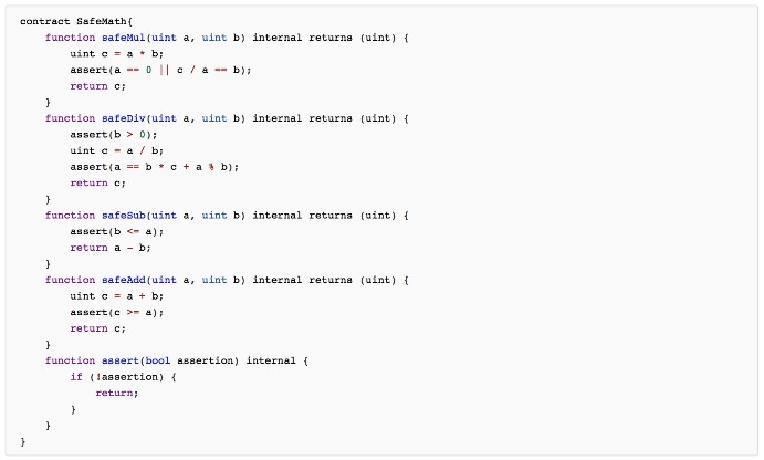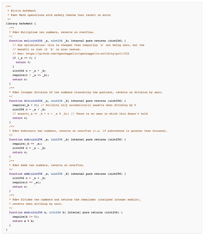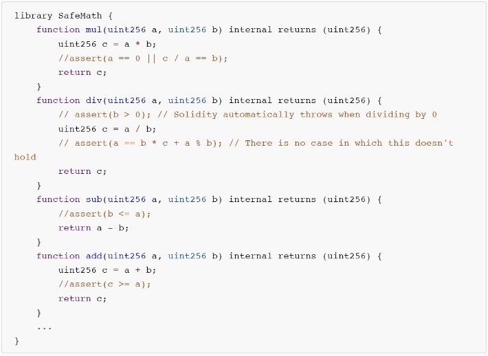 以太坊虚拟机EVM定义无符号整数为uint256,可以表示一个256位的大整数,但并没有提供溢出的检测机制。OpenZeppline是一个第三方智能合约库,实现了一套SafeMath库来检测溢出。其代码如下: