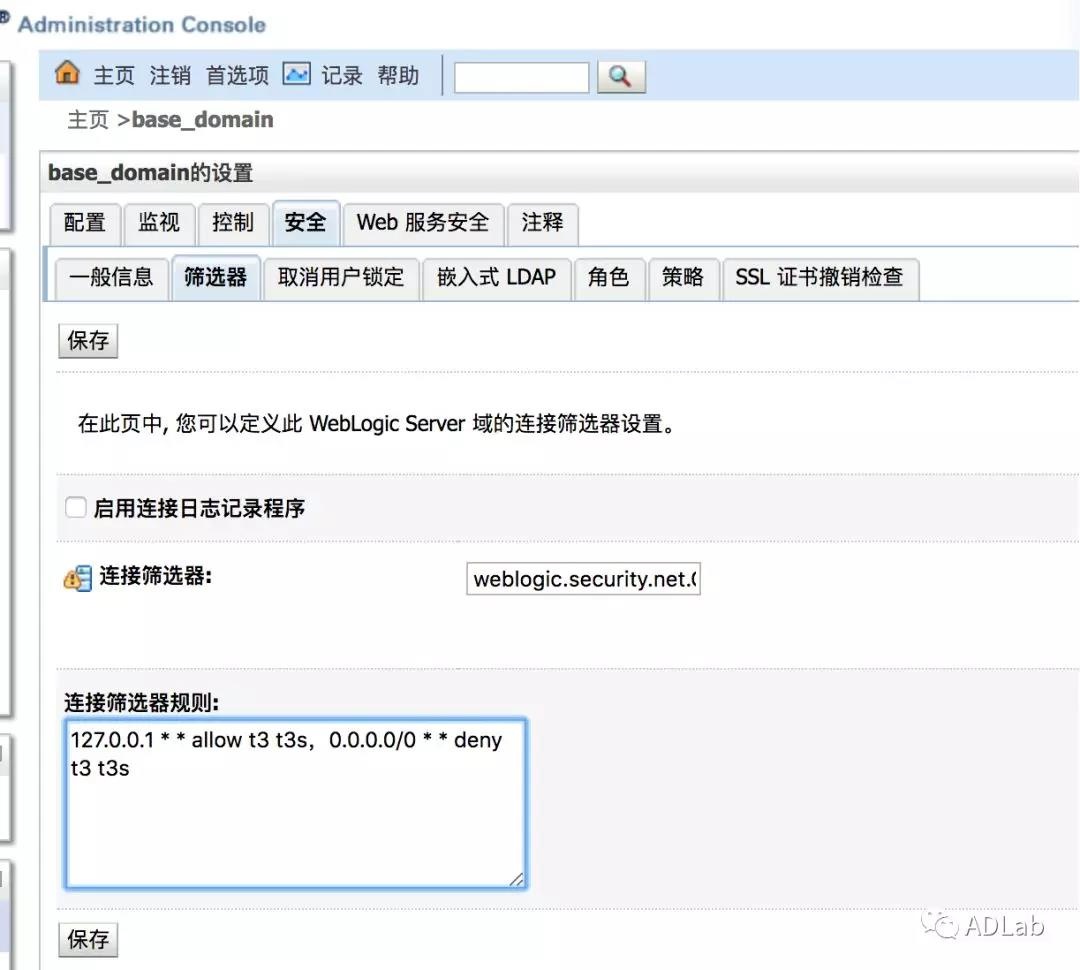 (1)进入WebLogic控制台,在base_domain的配置页面中,进入“安全”选项卡页面,点击“筛选器”,进入连接筛选器配置。