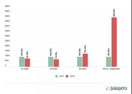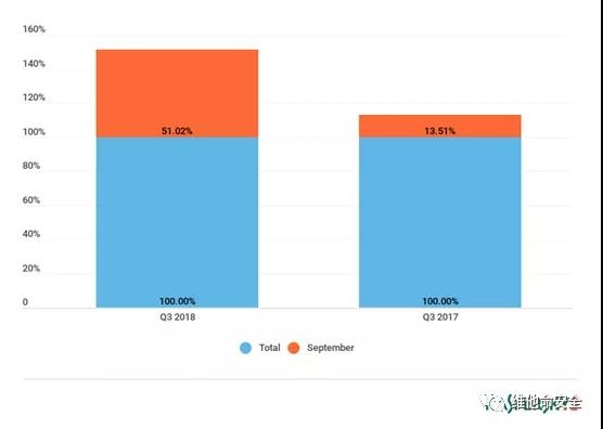 2017年及2018年9月份的DDoS攻击数量占Q3总攻击数量的比例