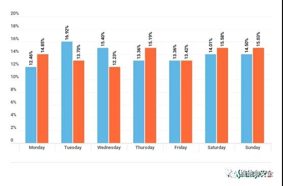 本季度DDoS攻击的星期分布则相对平均。星期六是最为“危险”的一天(其份额为15.58%),而上一季度冠军是星期二(本季度为13.70%)。星期二本季度变成了倒数第二,仅比星期三(12.23%)要多(译者:实际上星期五才是倒数第二,星期二是倒数第三。)。