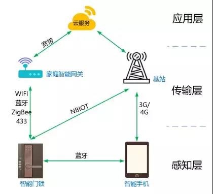 在感知层,由于受到功耗的限制,大部分智能门锁采用电池供电,其通信方式主要有蓝牙、ZigBee、NB-IoT、433MHz和315MHz等。也有部分门锁有条件采用交流电供电,该类门锁通常采用WIFI方式与云端进行通信。