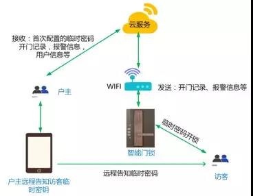 在临时密码开锁模式下,户主会通过手机APP从云端获取当前时段开锁的临时密码,并通过短信、微信或者手机APP等方式将临时密码发送给访客。