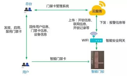 使用RFID卡的门锁,门禁管理系统会在RFID卡中写入代表该卡身份的字符串,在开锁时,门锁提取RFID卡中的字符串,并传输到云端进行对比,对比成功,则开锁。