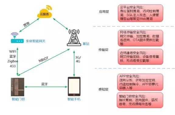 根据智能门锁的组网体系架构,其安全风险可以划分为以下五个方面:智能门锁安全风险(针对智能门锁设备的攻击)、移动应用安全风险(针对智能门锁手机APP的攻击)、近场通信安全风险(针对WIFI、ZigBee、蓝牙、433和315等通信方式的攻击)、网络安全风险(针对家庭智能网关和有线数据拦截的攻击)和应用安全风险(针对智能门锁云平台的攻击)。