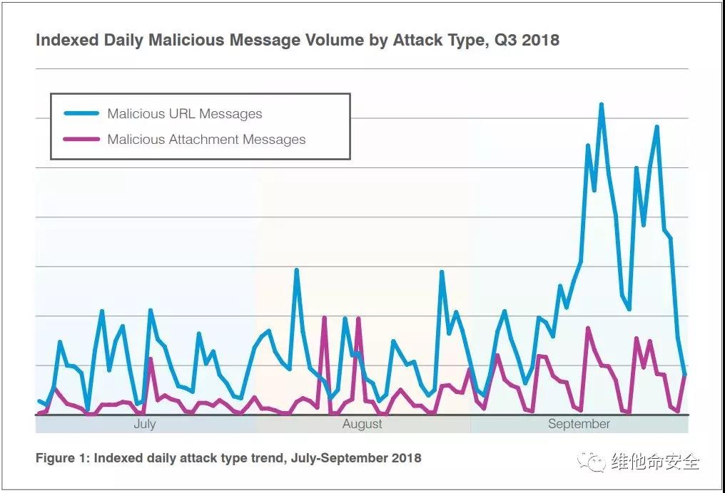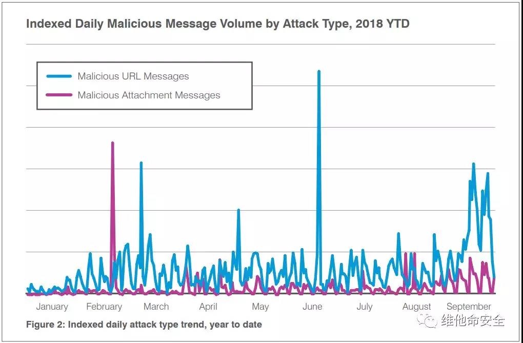 虽然9月份的增长究竟是一个趋势还是季节性的高峰,或者只是一个异常情况还有待观察,图2显示出整个2018年恶意URL和恶意附件的一个趋势变化。平均而言,恶意URL大概是恶意附件的380%。