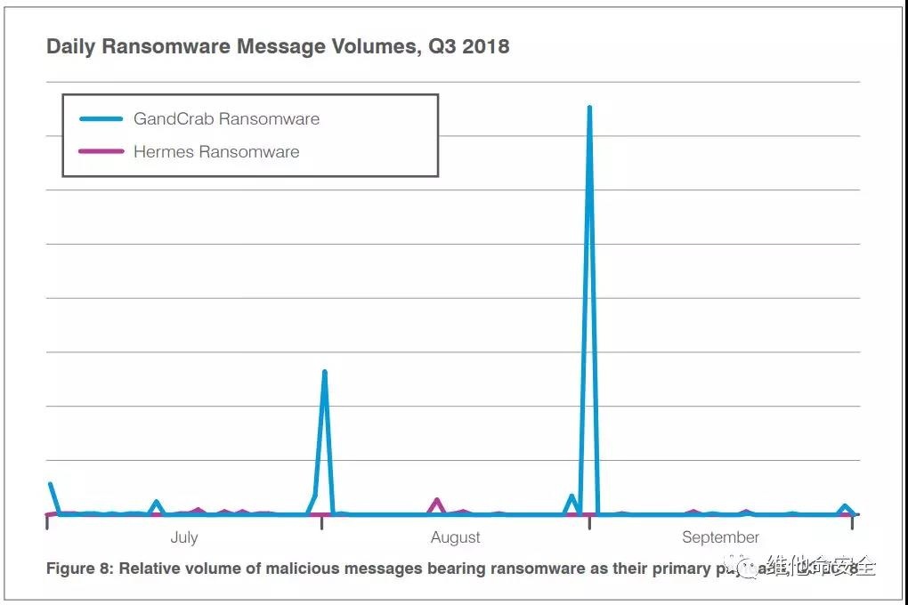 唯一的例外似乎是勒索软件GANDCRAB和Hermes,这俩似乎都在Q3偶尔有活动存在(如图8所示)。
