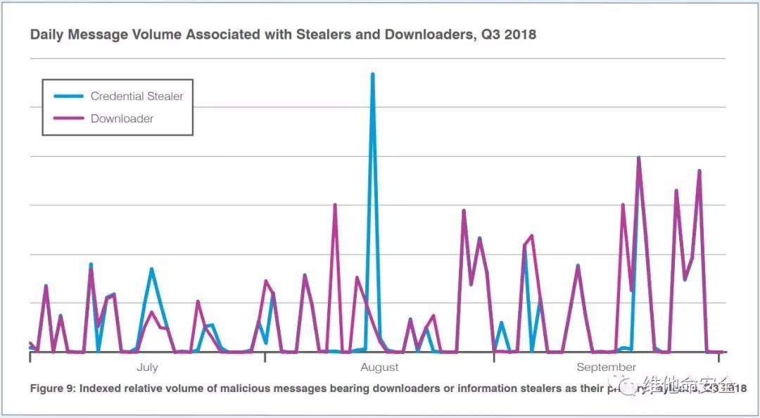 图9:2018年Q3,用于分发downloader和stealer的恶意邮件数量