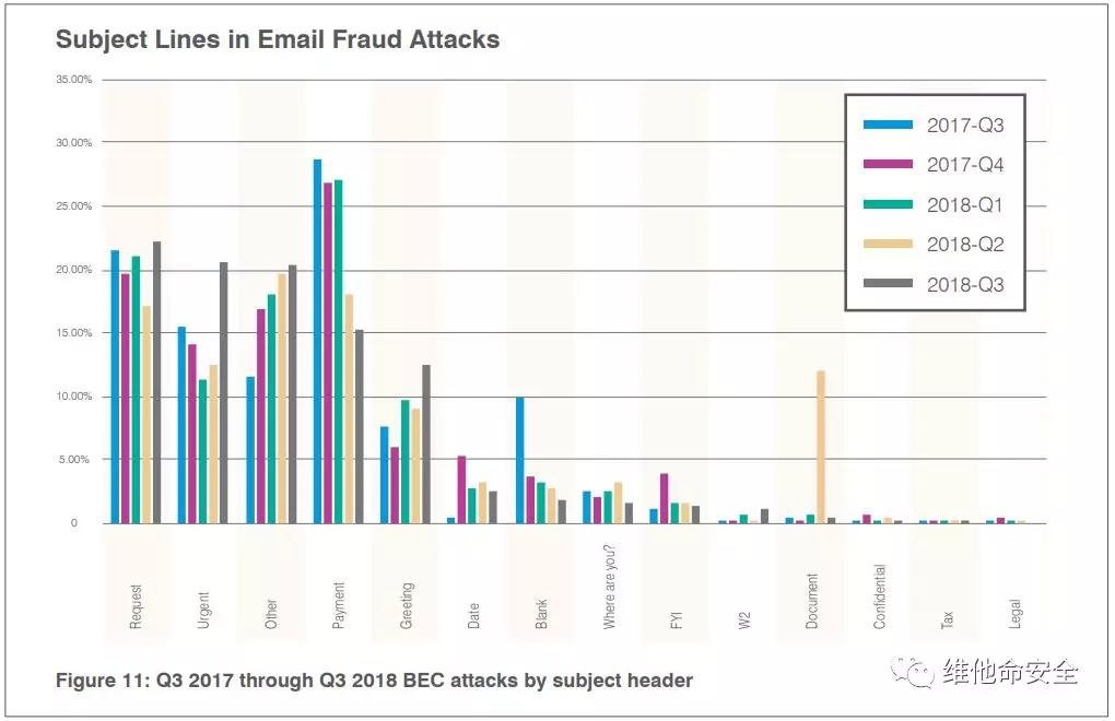 图11:2017年Q3至2018年Q3,BEC攻击中邮件主题的变化趋势