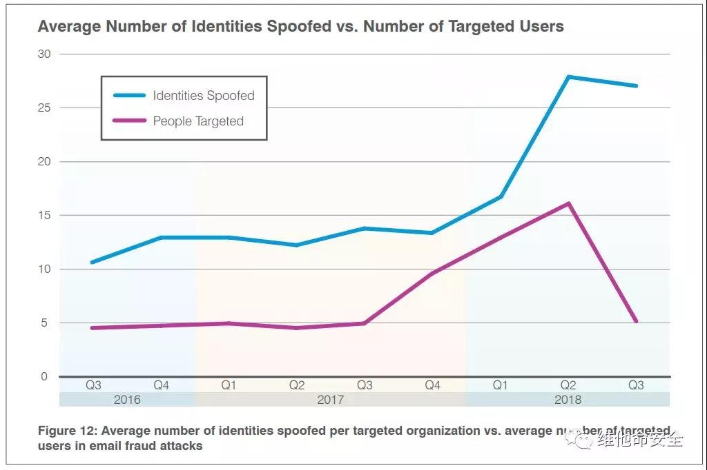 虽然伪装身份的数量下降了,但本季度每次攻击的平均目标数为27人,与Q2相比差不多,并且同比增长了96%。