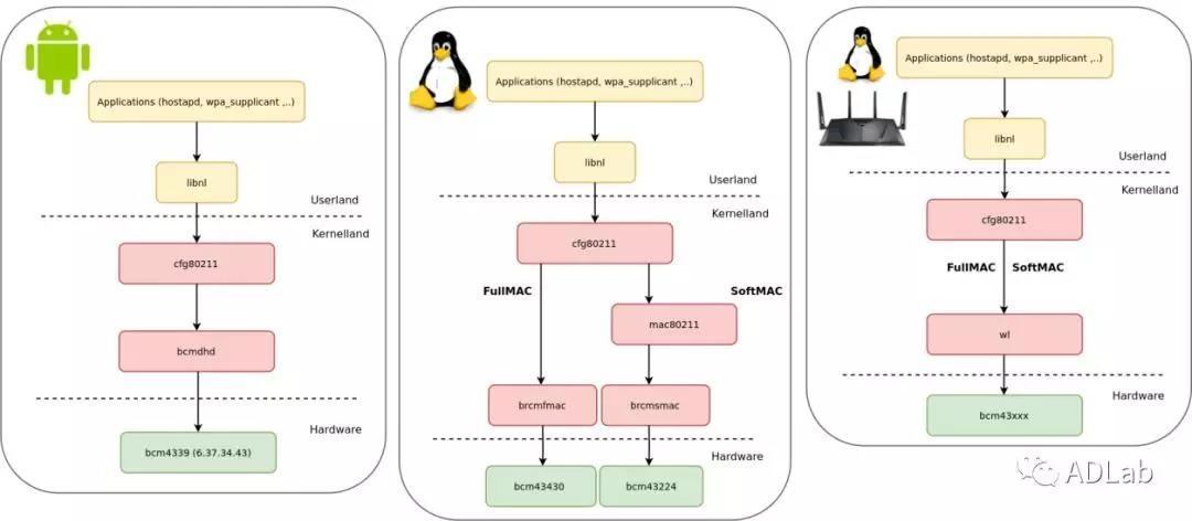 b43(Linux) brcmsmac(SoftMAC / Linux) brcmfmac(FullMAC / Linux) bcmdhd(FullMAC / Android) |