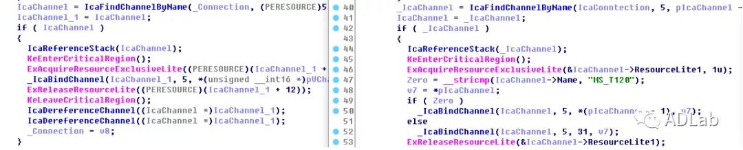 通过补丁包分析,我们发现补丁前后差异在于termdd.sys文件的IcaBindVirtualChannels及IcaReBindVirtualChannels,增加了对MS_T120协议通道的判定。如果是通道协议名为MS_T120,则设定IcaBindChannel的第三个参数为31。