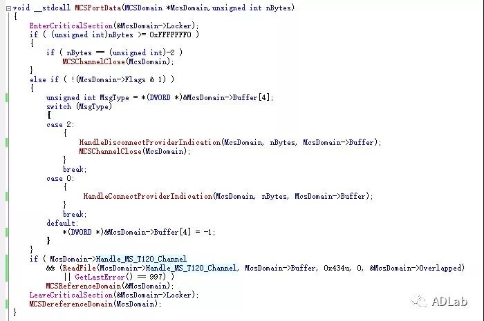 接下来,我们释放这个Channel。我们向MS_T120通道发送构造的数据,但由于这个通道已经被绑定到内置的MS_T120通道,所以数据最终会派发到相应的处理函数rdpwsx!MCSProtData中,然后调用MCSChannelClose函数关闭通道。