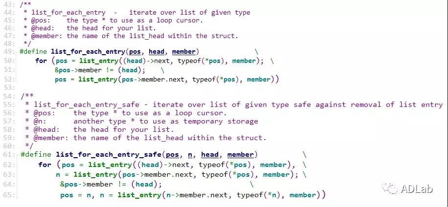 宏定义list_for_each_entry_safe中添加了一个n,该n用来存放pos指向的节点的下一个节点位置。使用该宏可以对链表进行删除操作。