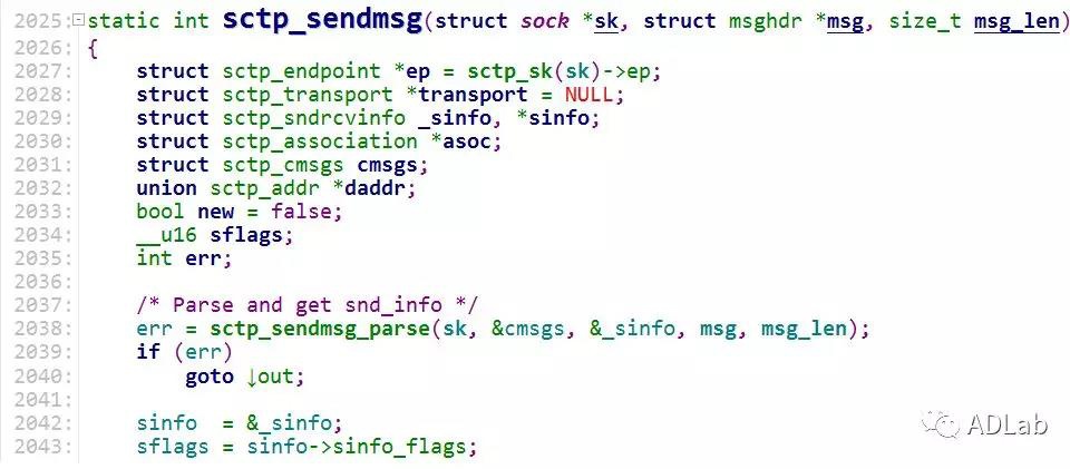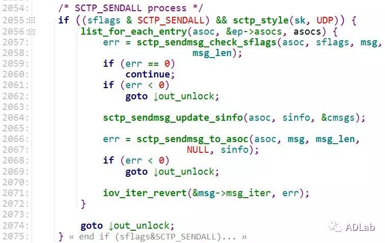 行2055,判断sflags是否为SCTP_SENDALL。如果存在,进入list_for_each_entry循环中,依次遍历ep->asocs链表。这里的asocs就是存放多个association连接的链表。SCTP_SENDALL标志代表向asocs链表中的所有association连接发送数据包。所以asocs链表中至少要存在一个association节点。进入sctp_sendmsg_check_sflags函数后,该函数实现如下: