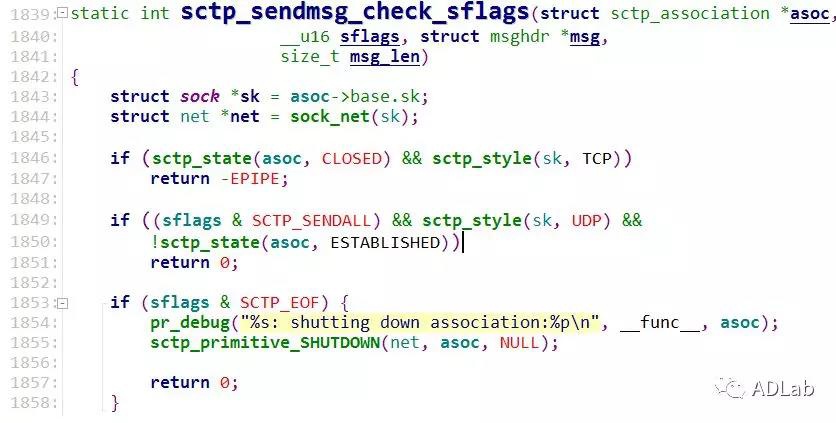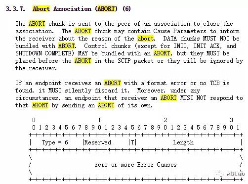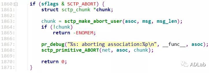 接下来,检查sflags是否为SCTP_ABORT,根据rfc文档可知ABORT的用法以及ABORT指令的数据包格式。SCTP_ABORT标志代表中止一个association连接,这个也是导致漏洞的关键。