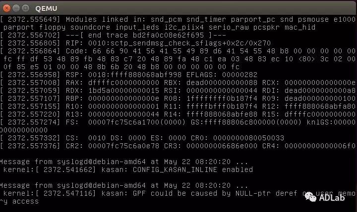 将sflags设置成SENDALL | ABORT,保证进入list_for_each_entry循环和sctp_sendmsg_check_sflags()函数即可。在4.20内核下验证如下。由于该漏洞是NULL-PTR deref,即是零地址解引用,无法进一步利用。
