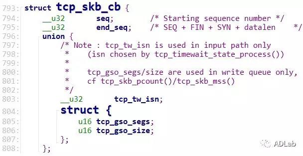 该tcp_skb_cb结构体存放着TCP每个数据包的控制信息,根据注释可知,tcp_gso_segs/size只用于写队列过程中。