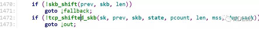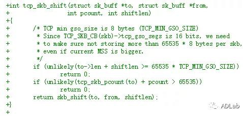 补丁中分别判断了skb->len+shift_len不能大于65535*8字节和tcp_skb_pcount(to) + pcount不能大于65535。第一个判断,skb->len是表示sk_buff结构体中表示payload长度,shift_len表示要合并到skb中的payload。