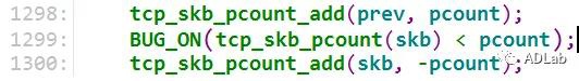 行1299,判断tcp_gso_segs和pcount的大小,如果tcp_gas_segs小于pcount,BUG_ON断言触发导致内核崩溃。