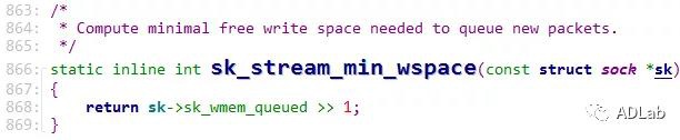 根据注释可知,判断最新排队skb包所需的最小可写空间。补丁中,判断剩余发送缓存为大于等于当前发送队列占用空间的一半,即还有1/3以上的空余空间时,并且小于sk->sk_sndbuf发送上限才可以正常发送,否则就判定TCP写队列太大。