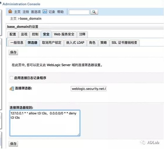 a)进入WebLogic控制台,在base_domain的配置页面中,进入“安全”选项卡页面,点击“筛选器”,进入连接筛选器配置。