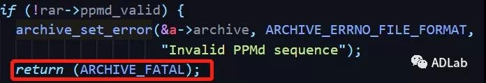 对于rar>ppmd_valid的设置,可以确保在rar_br_bits为0的情况下,类似构造的RAR文件在parse_code阶段始终可以返回ARCHIVE_FATAL。