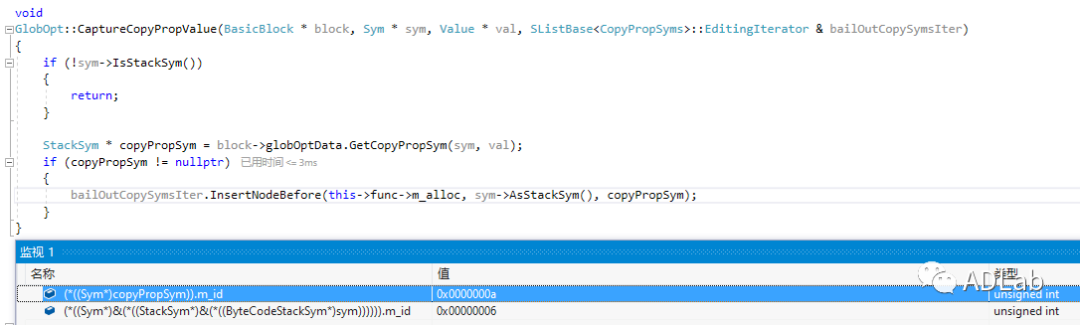 符号s10代表[1337],s6代表const修饰的arr。按照编译原理的术语,变量获取定义值称为def,变量值被使用称为use,在InitConst指令中s6被def,s10被use,随后在StElemC这条指令下,s6被use。可以看到s6与s10关系密切,s6可以看作s10按照另一种方法对同一变量的引用,ChakraCore称为copy-prop符号对原始符号的引用。但调试显示,这里发生了错误。