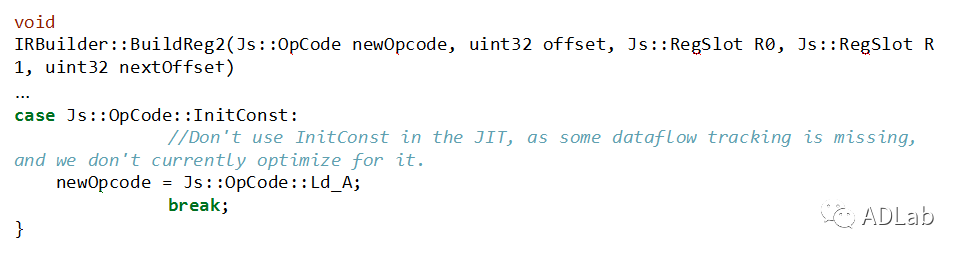 造成上述错误数据传播的原因在于InitConst这一指令其实没有在ChakraCore的JIT代码中得到正确的数据流分析,因此在微软的修复中,在JIT刚开始介入的时候,InitConst指令就被替换成Ld_A指令。