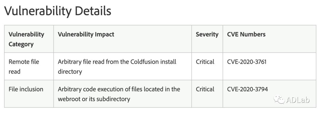 2020年3月18日,Adobe官方发布针对Adobe Coldfusion的安全更新补丁,编号为APSB20-16。补丁中包含威廉希尔500欧洲指数ADLab发现并第一时间提交给官方的Critical(危急)漏洞,Adobe ColdFusion 任意文件读取(CVE-2020-3761)和任意文件包含(CVE-2020-3794)漏洞。如下图所示:
