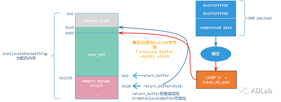 这里需要注意如下的数据关系:SrvNetAllocateBufferFromPool函数返回值return_buffer指向一个内存数据结构,该内存数据结构起始地址同实际分配内存(函数ExAllocatePoolWithTag分配的内存)起始地址的的偏移为0x1150;return_buffer+0x18位置指向了实际分配内存起始地址偏移0x50位置处,而最终return_buffer会作为函数SrvNetAllocateBuffer的返回值。其内存布局关系如图12。