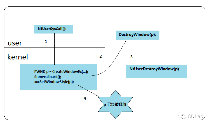 上述代码执行效果如下图所示,用户层执行的某函数通过syscall传入内核层,当内核层代码执行到somecallback这一句时,用户层可以在用户定义的callback函数中获得代码执行的机会,如果用户在callback函数调用了DestroyWindow函数销毁窗口p,内核层的相应销毁代码将会被执行,p的相应内存被释放,回调执行完毕,NtUserSysCall函数继续执行,当执行到xxxSetWindowStyle(p)一句时,由于p的内存已经被释放从而导致UAF漏洞的产生。