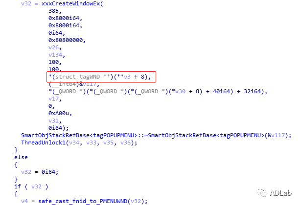 图中通过xxxCreateWindowEx可以获得一个返回用户层执行callback函数的机会,xxxCreateWindowEx创建的窗口将作为父窗口*(struct tagWND **)(**v3 + 8)(上图红框)的子窗口,如果我们可以通过ThreadUnlock释放父窗口,那么子窗口v32也会被释放,所以当后续的safe_cast_fnid_to_PMENUWND函数将v32作为参数执行时就会产生问题,值得注意的是通过回调释放v32是行不通的,如果这样xxxCreateWindowEx将会返回0,无法通过if判断。