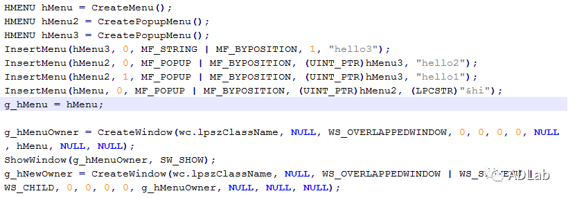 首先我们创建了g_hMenuOwner和g_hNewOwner两个窗口,其中g_hMenuOwner的菜单句柄为hMenu,它也是g_hNewOwner的所有者。