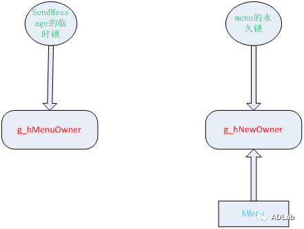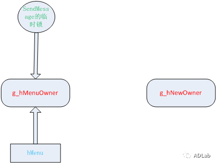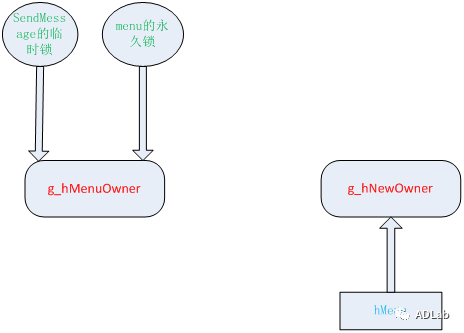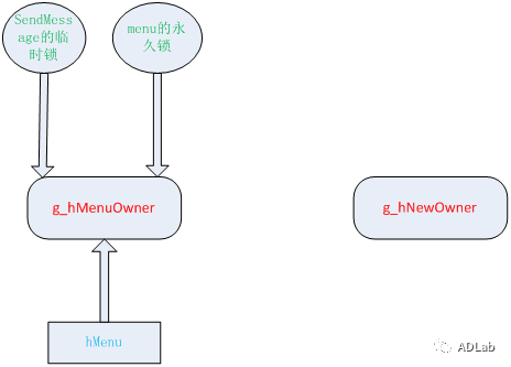这个时候,所有的锁都已经转移到了g_hMenuOwner身上,而由于WH_CBT钩子已经被移除,menu将被弃用,g_hNewOwner将把新创建的窗口link到自己身上。这个时候情况变成了下面的样子,g_hNewOwner身上已经没有需要绕过的锁了。