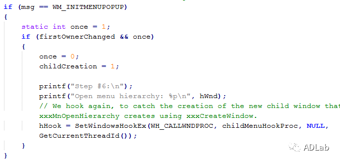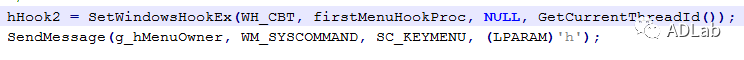 此时通过设置WM_INITMENUPOPUP回调来获得用户层执行的机会,WM_INITMENUPOPUP回调函数通过SetWindowsHookEx函数设置了一个新的hook,目的是为了在xxxMnOpenHierarchy函数创建子窗口的时候获得用户层执行权限。