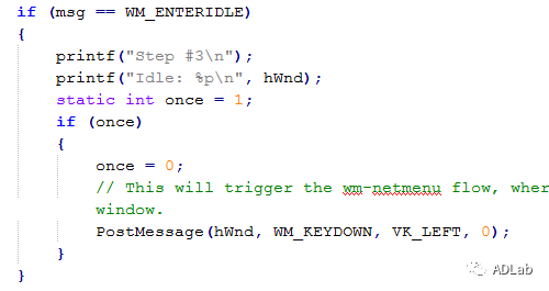 当接收到的消息为WM_ENTERIDLE时,我们在窗口的消息回调中通过PostMessage下发消息。