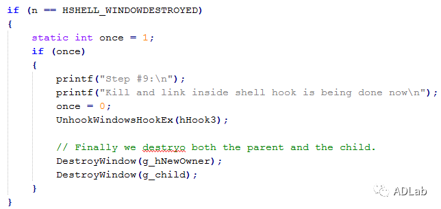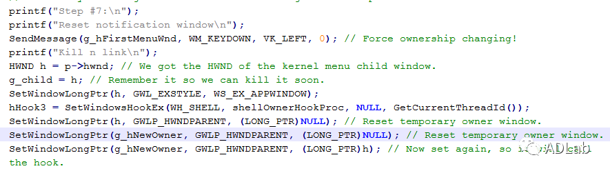 接着childMenuHookProc通过SetWindowsHookEx函数又一次设置了回调函数并通过SetWindowLongPtr函数来调用它,回调函数销毁了g_hNewOwner和xxxCreateWindowEx生成的新窗口。