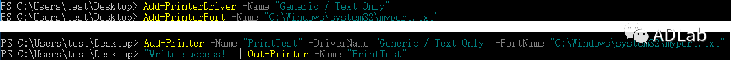 在添加一个打印机时,需要安装打印机驱动。在MSDN文档描述中,早期系统要求只有具备SeLoadDriverPrivilege权限的用户才能安装打印驱动,但为了便于标准用户安装驱动,从Windows Vista开始,只要打印机驱动是已经存在的可立即使用的驱动,就不需要任何特权即可安装。例如,通过一条PowerShell命令即可安装“Generic / Text-Only”驱动。