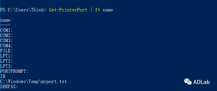 在添加一个打印机时,需要设置打印机的端口。Windows支持多种类型的打印机端口:LPT1端口、USB端口、网络端口和文件等。如果设置端口为文件,则意味着打印机将数据打印到指定文件。例如,通过一条PowerShell命令即可添加一个输出到指定文件的打印端口: