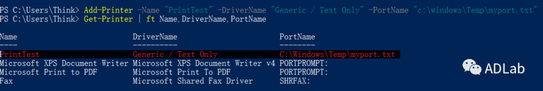 准备好驱动和端口后,通过一条PowerShell命令即可创建一个打印机。