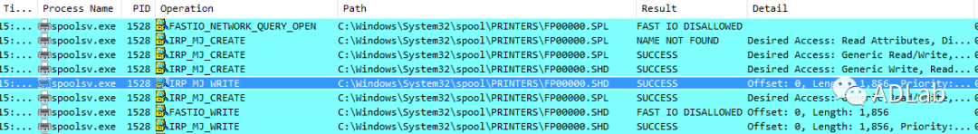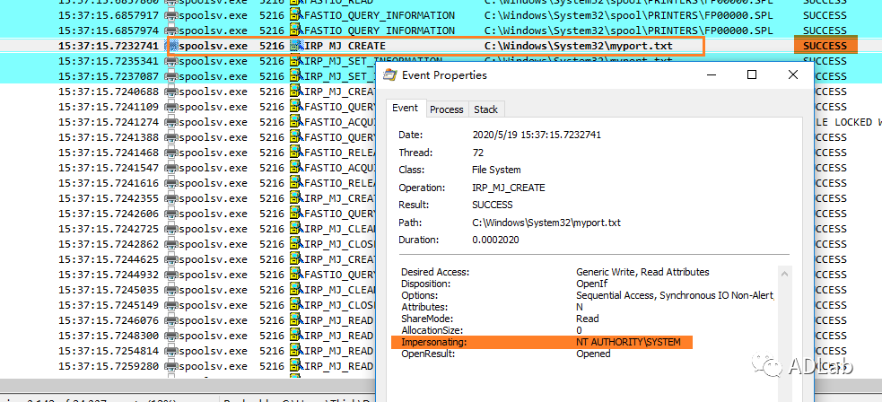 针对端口是文件的打印过程,spooler打印服务程序以impersonating方式来模拟当前用户的特权进行文件写入。因此,如果端口文件在受保护的系统目录(例如C:\Windows\system32), 则非管理员下的PowerShell打印作业就会失败。