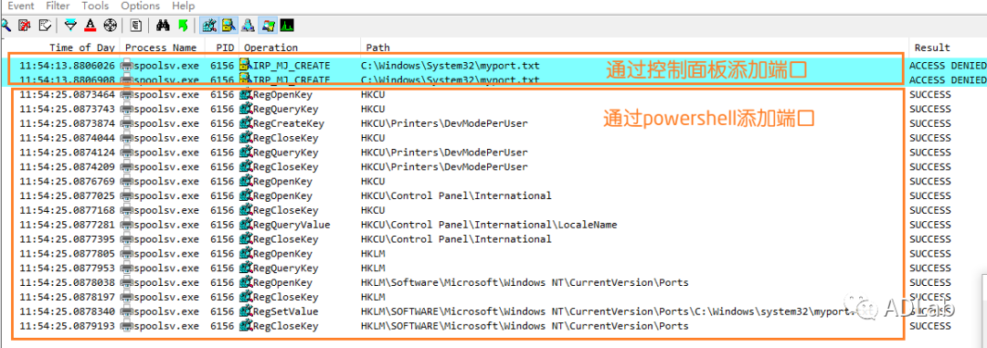 具体来讲,针对PowerShell命令添加打印机端口,spooler程序直接设置了相应的打印机端口注册表项;针对控制面板添加打印机端口,spooler程序会首先尝试创建该端口文件,创建失败后就不会再设置相应的注册表项。