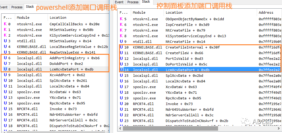 通过控制面板添加打印机在底层是调用了AddPort函数,该函数会触发spooler程序对端口的合法性校验。通过PowerShell命令添加打印机在底层则是直接调用XcvData函数,该函数不会触发spooler程序对用户添加的端口进行安全校验。因此,测试程序AddPort.exe通过该函数在标准用户权限下也能设置打印机端口为受保护目录中的文件。